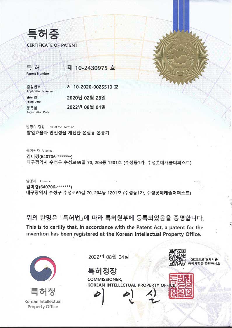 특허 발열효율과안전성을 개선한 온실용 온풍기 > 특허증